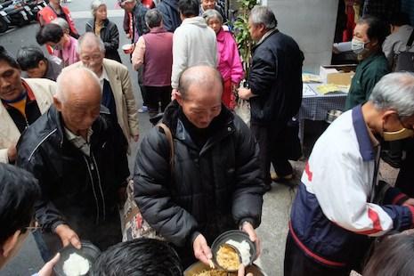 Homeless people in Taipei line up outside the Grace Home Church(基督教恩友中心) for free food(法新社報導)