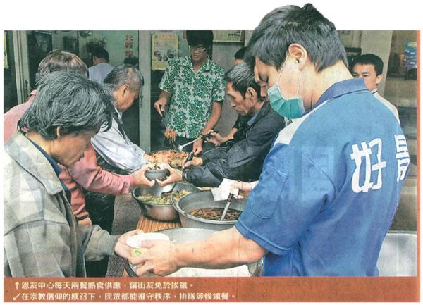 卅五歲的阿國(化名),從台南來台北求職不順遂,三個禮拜前,他花完身上所有的錢,餓到頭昏眼花,一度絕望到想要尋短見,有人介紹他到後火車站華陰街的基督教恩友中心求助,中心人員好言安慰、供他吃住,介紹他先擔任短期清潔工,阿國的心終於安定下來,打算等經濟好轉,找份長期性的工作,在台北立足。