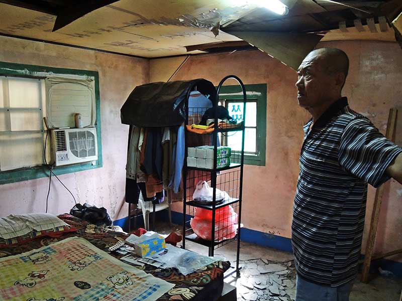 許國寶住的20多坪祖厝,木製天花板毀損掀起,會漏水,地磚也碎裂,但他無力修繕。
