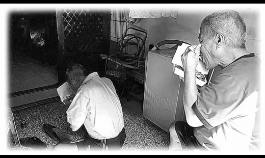 按了電鈴,在門外那頭喊著:「鄭伯伯,您在家嗎?」進了擁擠及非常悶熱的屋內,只留一盞微弱的日光燈及蒼白病容和歡迎我的絕望聲音… 鄭伯伯要我自行開門,自行找個椅子坐,但說真的連站的空間都不足…屋內空氣中是飄著廚餘味及尿騷味…進了大門後才知,原來伯伯行動如此不便。