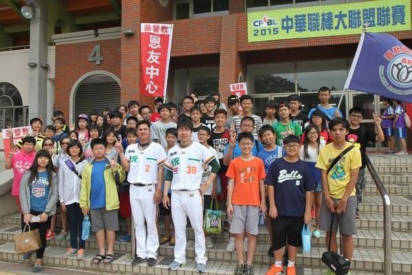 統一獅今(9日)在嘉義市球場與中信兄弟交手,本季嘉義首戰由於基督教恩友會招待來自全國各地8千多位弱勢家庭兒童,賽前獅隊球星「雞排」江承峰、陳俊輝在場外與小朋友進行拍照會。
