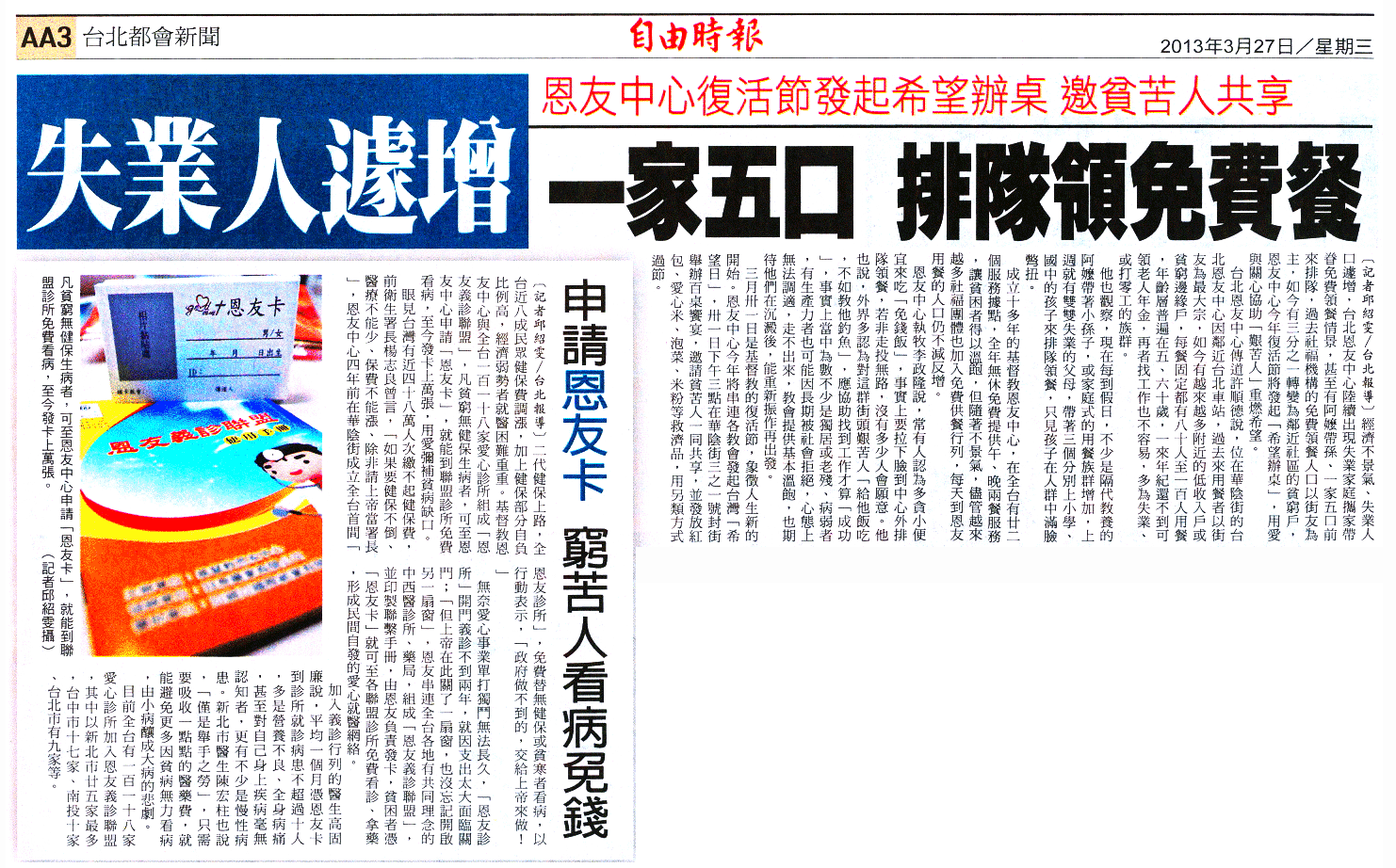 三月卅一日是基督教的復活節,象徵人生新的開始。恩友中心今年將串連各教會發起台灣「希望日」,卅一日下午三點在華陰街三之一號封街舉辦百桌饗宴,邀請貧苦人一同共享,並發放紅包、愛心米、泡菜、米粉等救濟品,用另類方式過節。