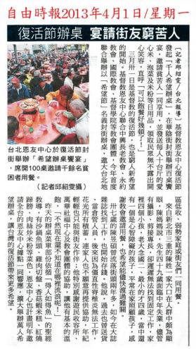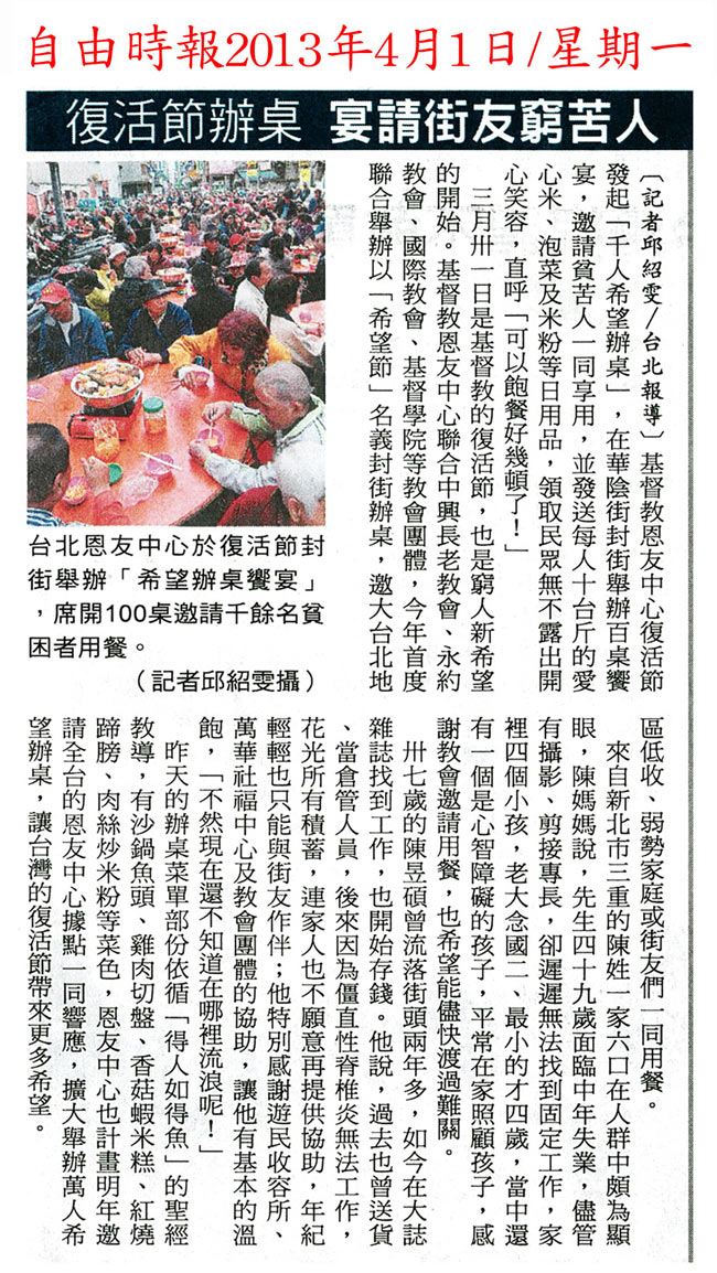 三月卅一日是基督教的復活節,也是窮人新希望的開始。基督教恩友中心聯合中興長老教會、永約教會、國際教會、基督學院等教會團體,今年首度聯合舉辦以「希望節」名義封街辦桌,邀大台北地區低收、弱勢家庭或街友們一同用餐。