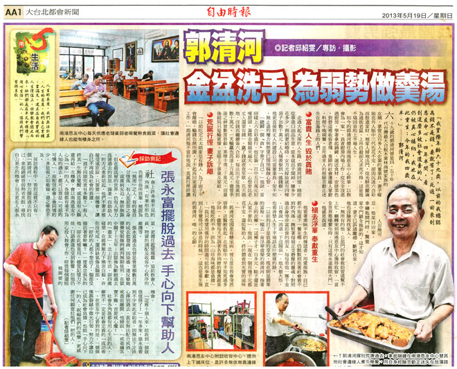如今的郭清河擔任南港恩友中心幹事,以教會為「家」,負責廚房內場工作;從完全沒進過廚房,學著拿起鍋鏟,運送食材、安排菜色,到替這裡收容老殘、重障的社會邊緣人掌廚,料理午晚兩餐,並用過來人的經驗苦勸正迷失在放蕩路上的人們。