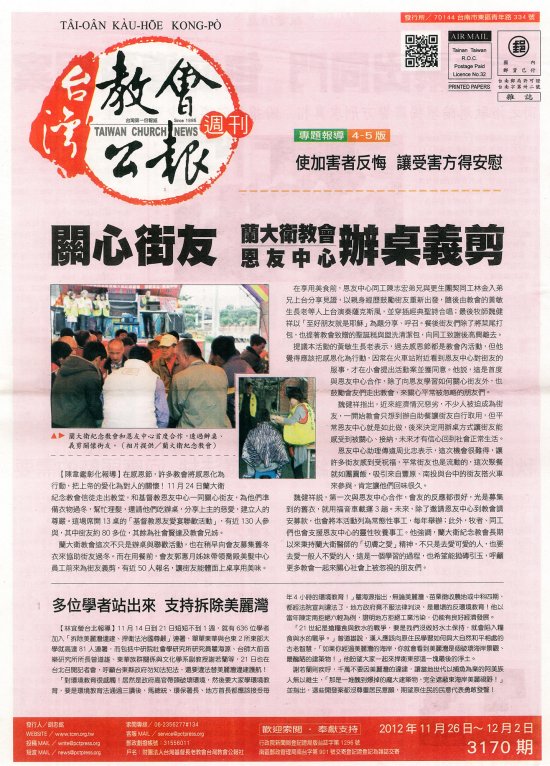 【陳韋鑑╱彰化報導】在感恩節,許多教會將感恩化為行動,把上帝的愛化為對人的關懷!11月 24日蘭大衛紀念教會信徒走出教堂,和基督教恩友中心一同關心街友,為他們準備衣物過冬,幫忙理髮,還請他們吃辦桌,分享上主的慈愛,建立人的尊嚴。這場席開13桌的「基督教恩友愛宴聯歡活動」,有近 130人參與,其中街友約 80多位,其餘為社會賢達及教會兄姊。