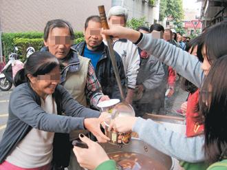 昨天冬至,台中街頭出現暖陽,靜宜大學師生忙著煮熱湯圓並分送保暖衣物給50多名街友,讓他們暖身也暖心,1名60歲街友捧著熱湯圓,不斷向大學生道謝。