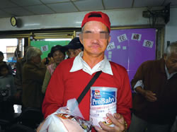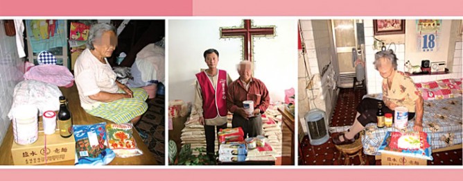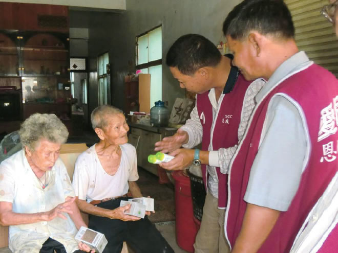 從2009 年八八水災時恩友中心得知阿公阿嬤的需要,除了發送雜糧物資、便當餐食外,還向冠泰藥業募得眼藥與維他命保健品給阿公阿嬤。阿公阿嬤相依為命,平日無子女可依靠,每每看到中心的同工前來關懷與分送物資就很開心,也看到阿公阿嬤的身體情況慢慢改善。