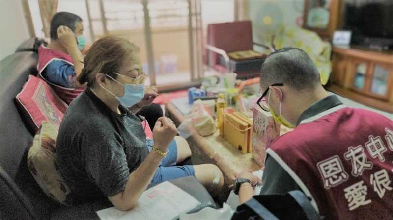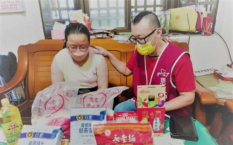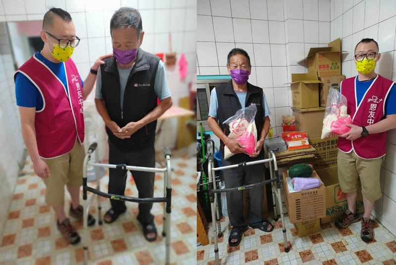 恩友同工來到阿勳家中探望,也帶來一些蔬果、米糧讓他在疫情期間能補充營養,為他禱告,求主保守他身心健康、出入平安,阿勳很感謝主耶穌差派恩友中心來照顧他,讓體弱又不良於行的他無後顧之憂。