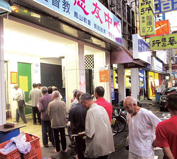 位於三民區力行路的基督教恩友中心,從1 年多前,除週一休息外,每天午、晚餐為街友準備三菜一湯熱騰騰飯菜,由街友自備餐具,排隊依序享用,每天大約供應 150 人次。
