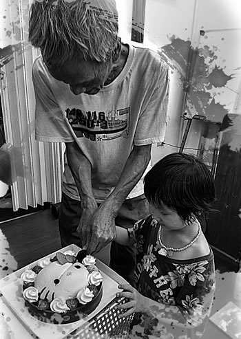 在生日快樂的歌聲中,kitty笑的好開心。所有阿公阿嬤,伯伯阿姨們替她祝賀。