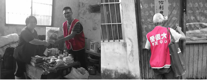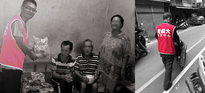 楊先生在工作時不甚從工地重率傷及瘠髓。又開刀失敗造成全身多重器官衰竭。本中心每月發送物資濟貧時,看到兩位小朋友很喘地推著輪椅來領取物資。而後同工帶者志工親自一街一街過馬路推輪椅送楊先生回家。並送上生活所需的白米、麵、罐頭及營養品,並為他們全家祝福禱告!