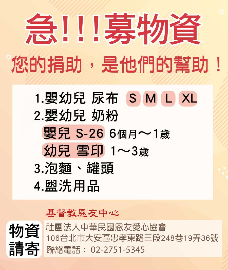 恩友中心同工得知後,趕緊帶著營養補給品及嬰兒衣物,到小平的住處探訪,了解她目前急需 S 或 M 號尿片和有嬰兒衣物、用品,我們隨即在恩友中心臉書分享勸募資訊,期盼能一起幫助這對母女安然度過難關…