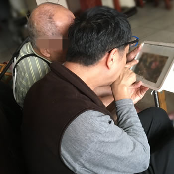 溫伯伯告訴我們他跌倒的經過,也聊起一些自己過往的事情,和同工們介紹家人的照片…